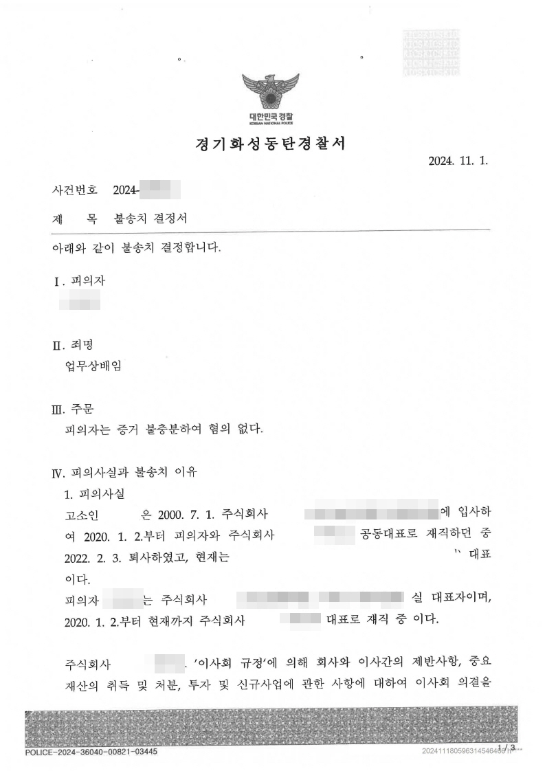 회사의 전 공동대표이사가 현 대표이사(당시 공동대표이사)를 업무상배임으로 형사고소한 사안