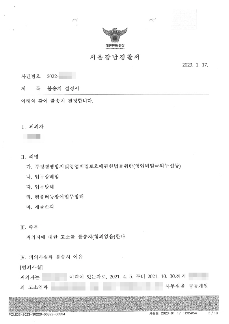 이에 前 동업자(고소인)은 의뢰인이 병원에서 근무하며 환자관리정보를 무단 유출하고 컴퓨터를 포맷하여 진료 업무에 장애를 발생하게 하였다며 영업비밀누설, 업무방해, 재물손괴 등의 혐의로 형사고소 하였다.