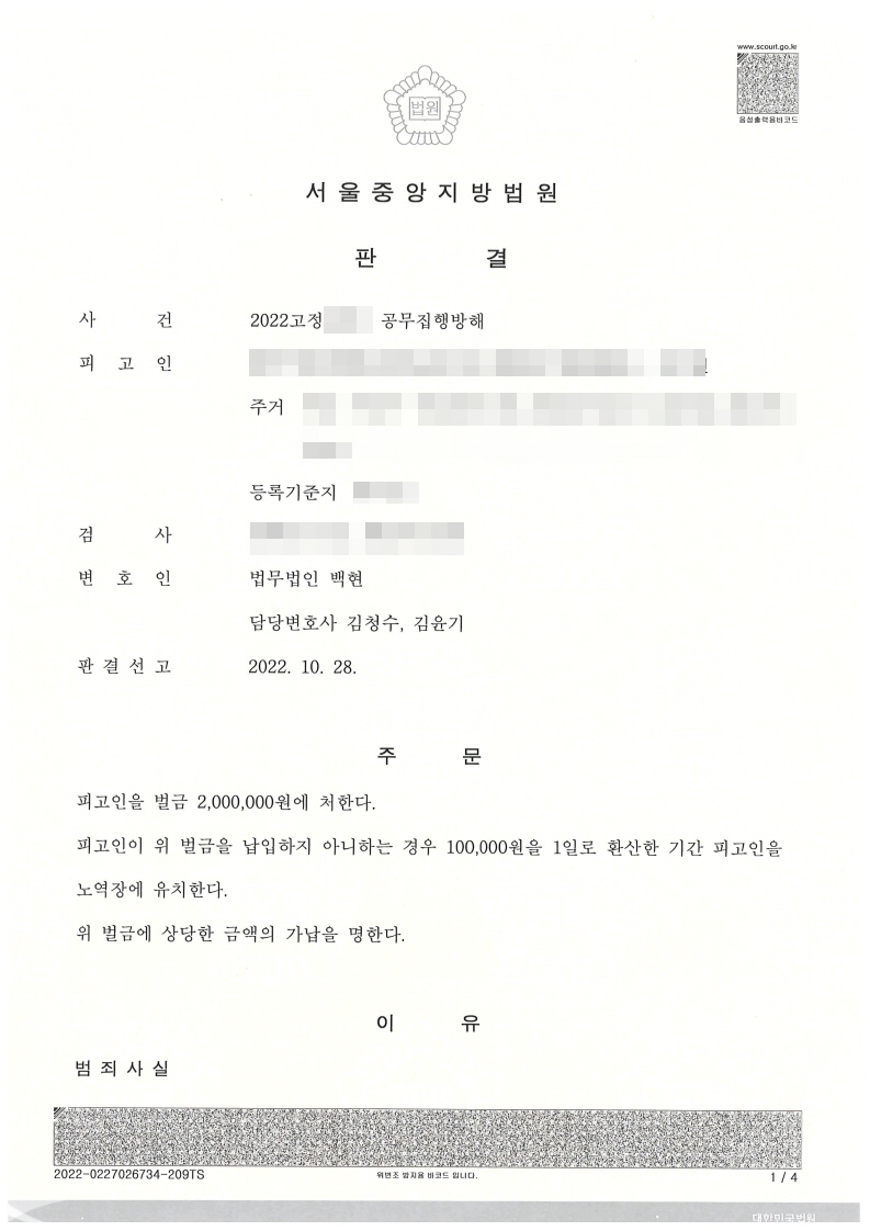 백현의 변호사는 의뢰인과 함께 경찰관을 찾아가 합의하여 합의서를 제출하고, 의뢰인이 외국에 있는 가족들 생계를 책임지고 있는 사정, 벌금 300만원 이상 선고받게 되면 추방될 가능성이 높은 점 등을 기재한 변호인의견서를 제출하며 선처를 요청하여 벌금 200만원을 선고받았음